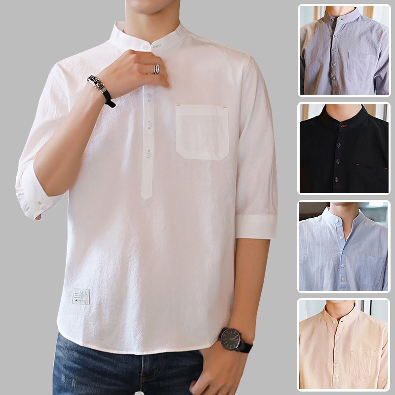 Style Baju Kemeja Lelaki / Forest Cotton Woven Long Sleeve Mandarin Collar Plain Men Shirt Baju Forest Clothing